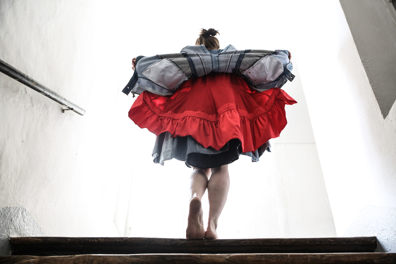 What is right and what is wrong? What is front and what is back? Looking from a place of pure joy, none of it matters. All that exists has a great potential for creativity, craziness and fun. Come along, let's do it. Let's dress back as front or front as back. Or maybe stop halfway. This piece of creation gives you a chance to be a little bit crazy even in the early hours of a rainy morning. Turn it around and around and find a look that suits you for this day and this feeling. Dare, smile and enjoy your day! The skirt is not too delicate to adapt to every situation. Even if you're running late, rushing with your bike, you can put the skirt into your backpack or bag and wear it later. It will become even crazier stylish with its wrinkled character!
